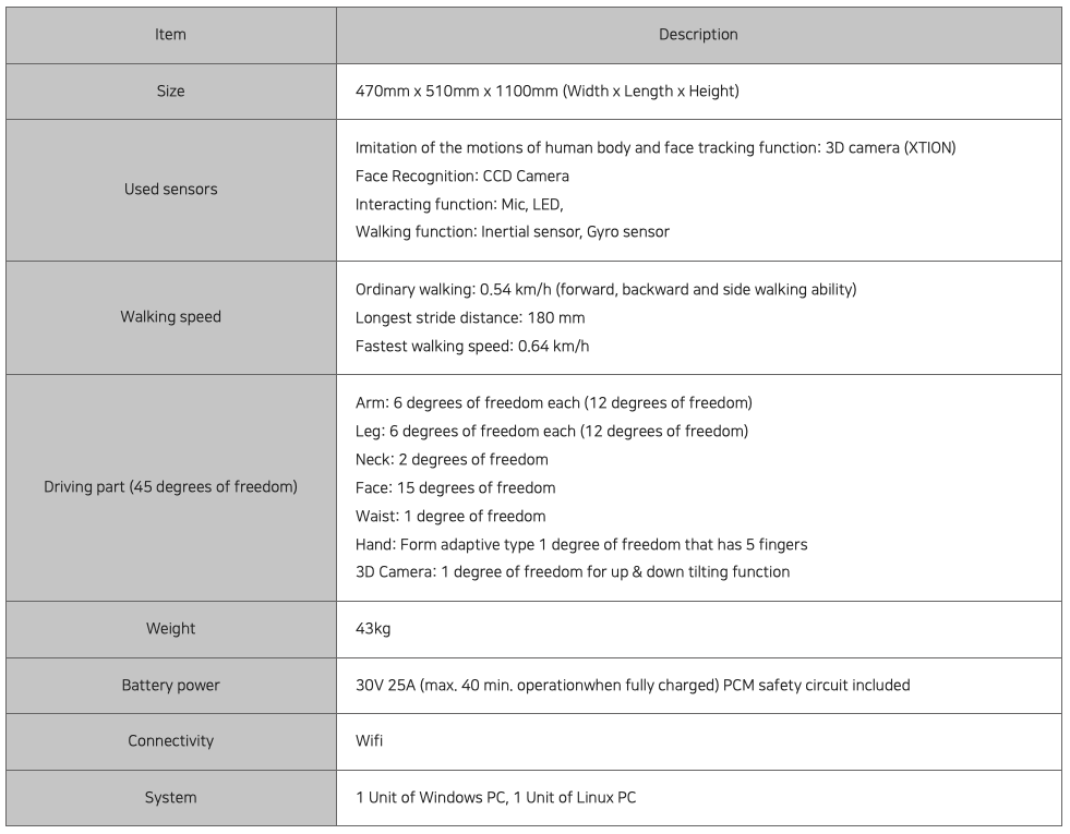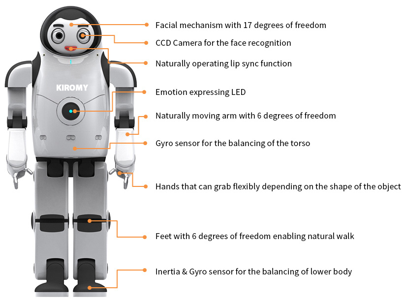 Face that can express various emotions and bipedal walking system are the most advanced features of KIROMY was released in March 2011 and is a bipedal walking humanoid robot system, enabling effective expression and communications between human and robot through various facial expression, lip sync, facial recognition, and objects recognizing functions.