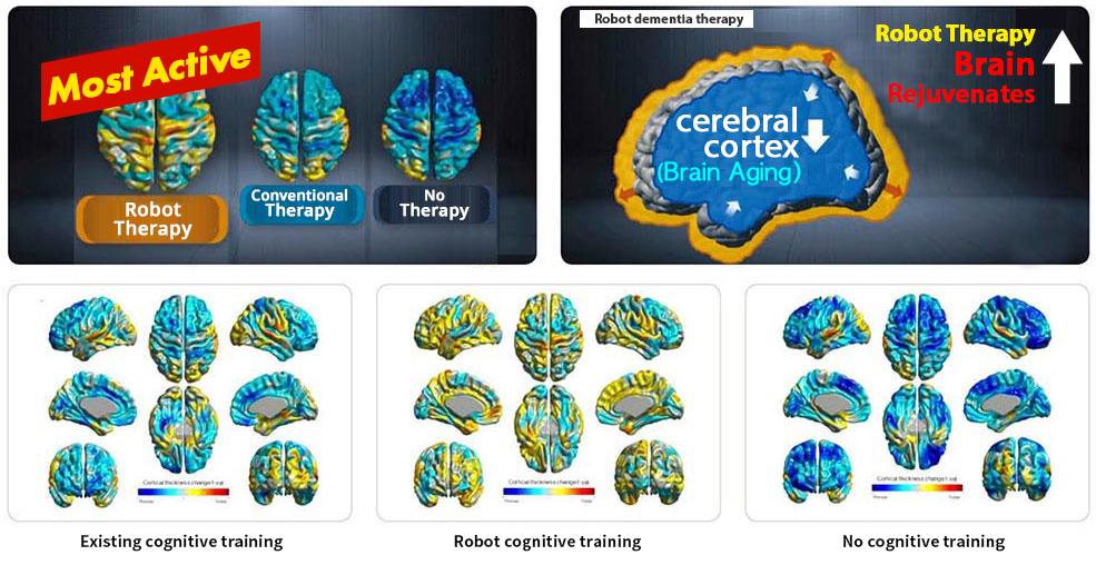 Effects to brain of cognitive training program with robot is analyzed using MRI (Magnetic Resonance Imaging) device and presented to SCIE Journal ‘PLOS One’. Comparison of the cerebral cortex thickness of the participants before and after 3 months of robot cognition training program (MRI) shows the thickness of cerebral cortex of group from the robotic cognitive training program is increased by 0.004mm, while the no-training comparison group became 0.028mm thinner and with human teacher training became 0.012mm thinner.