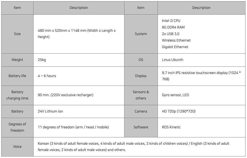 HRI (Human Robot Interaction) technology : It recognizes user’s intention, makes eye contact with the user, and expresses emotion. Approx. 300 kinds of emotion expressions and 3D avatar technology available : It has 3D avatar user friendly design. Autonomous Mobile Robot : Omni wheels that can be used regardless of the intention and obstacles is applied